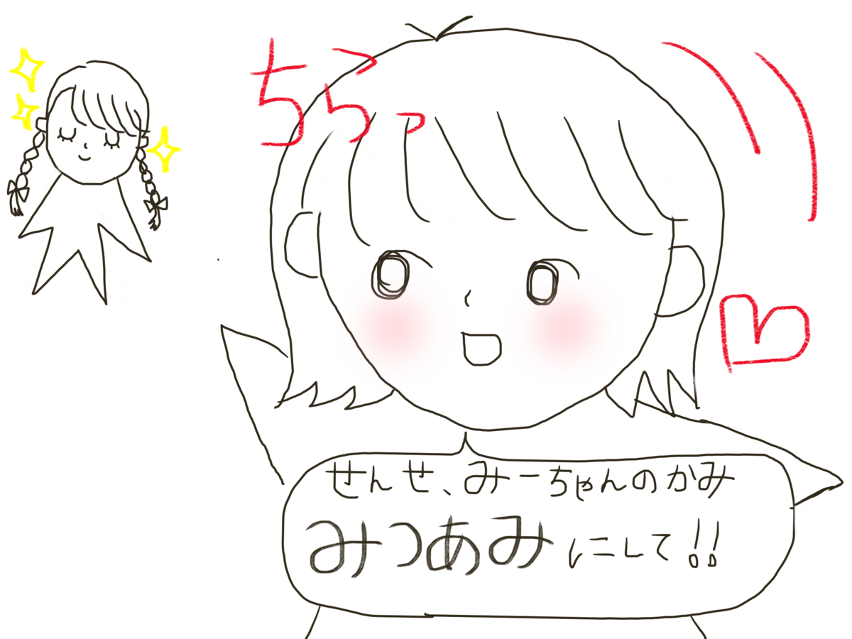 年上の女の子たちが髪をいじっていると、そんな光景をじっーと見つめては真似っこしようとする姿に毎度キュンとします。